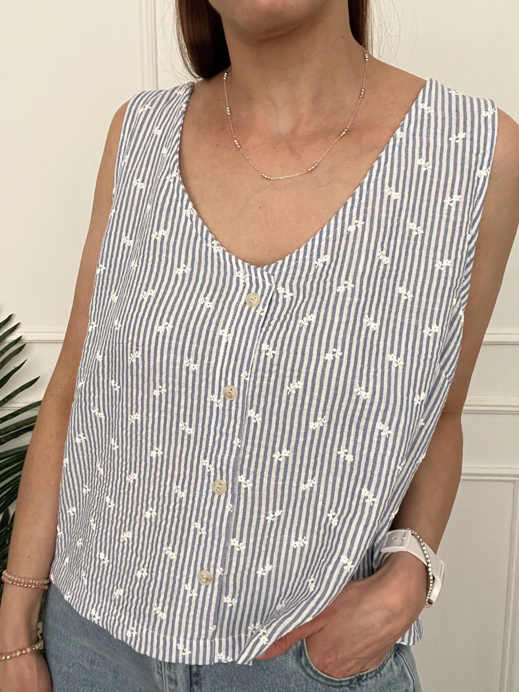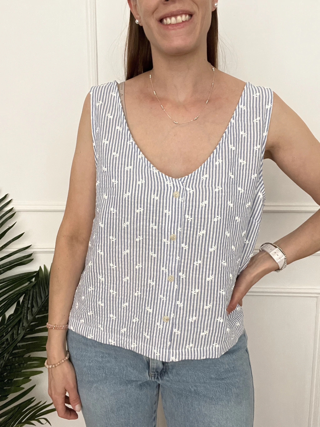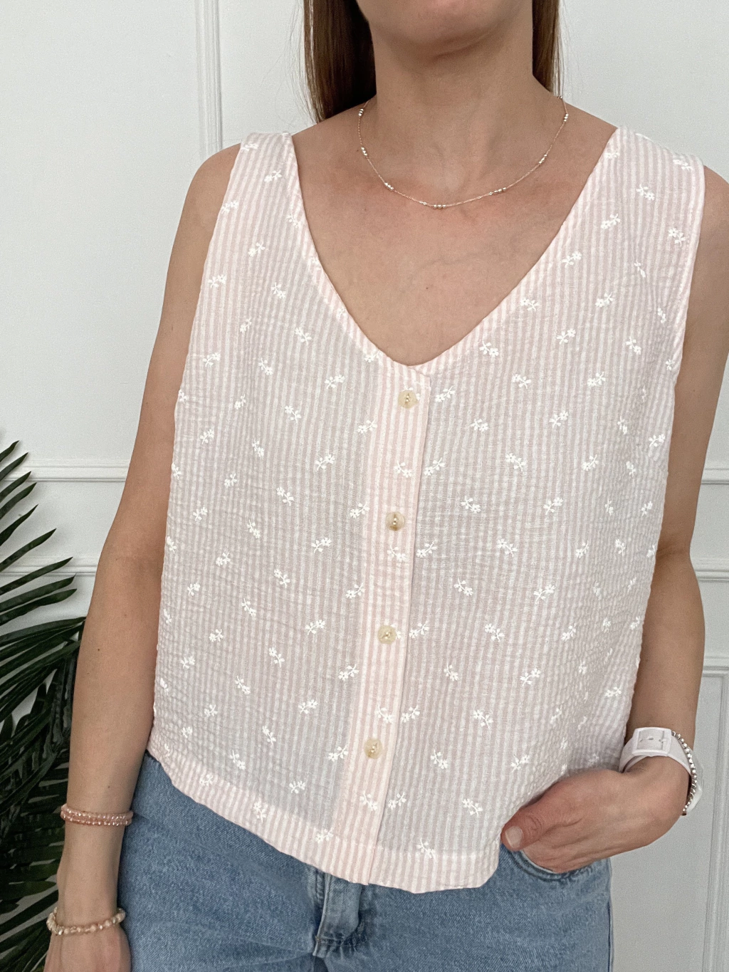 Un modelo estampado, con un diseño super delicado. Es muy fresca, los botones no se abren, son de vista. Si queres estar fresca y comoda este verano, no te puede faltar esta blusita.