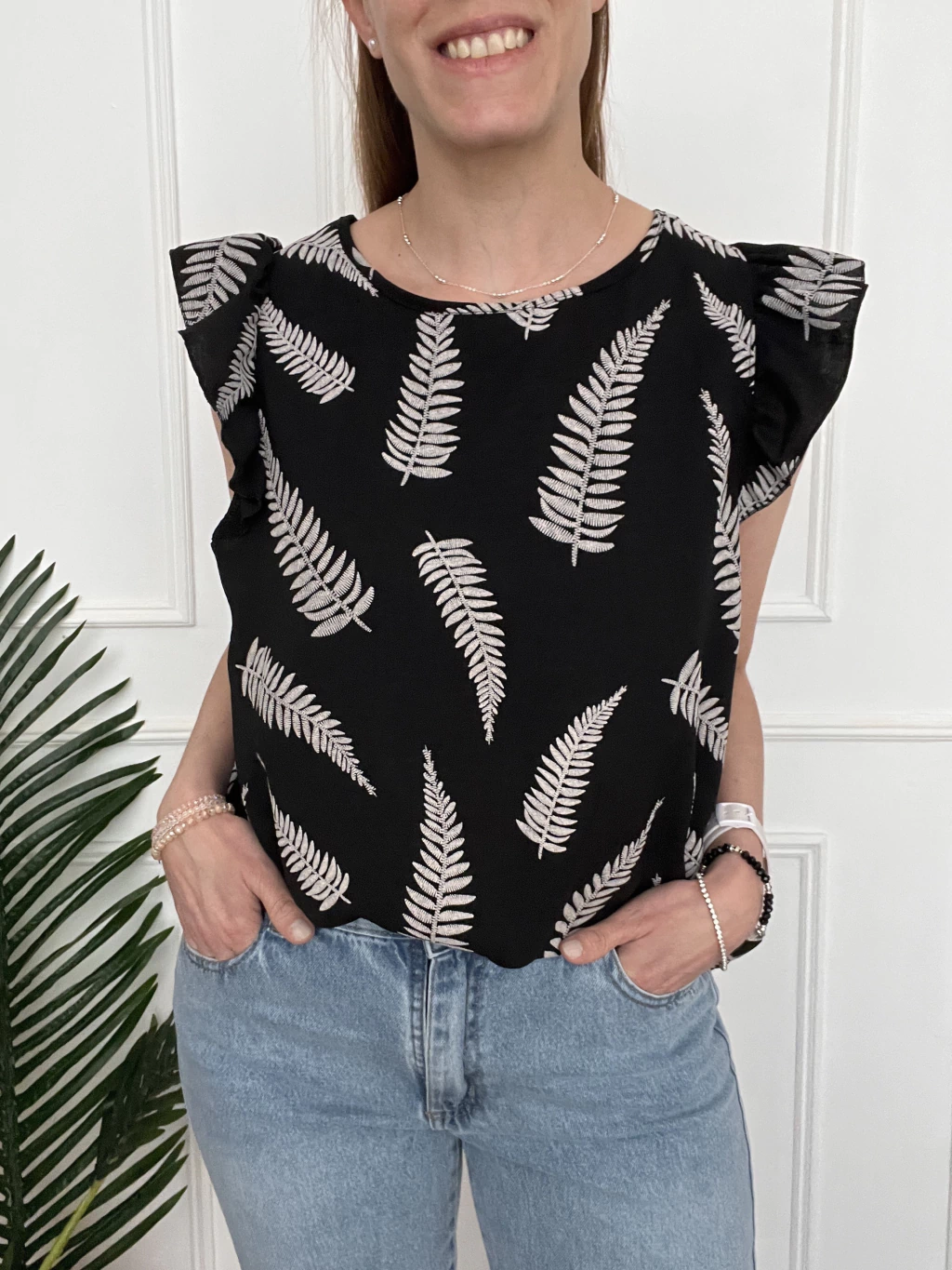 Una blusa con una estampada muy combinable, es super muy fresca, comoda y canchera. Es de creep, una tela que no se plancha y no se arruga. Los volados en la manga y el cordón en la espalda le dan un detalle único.